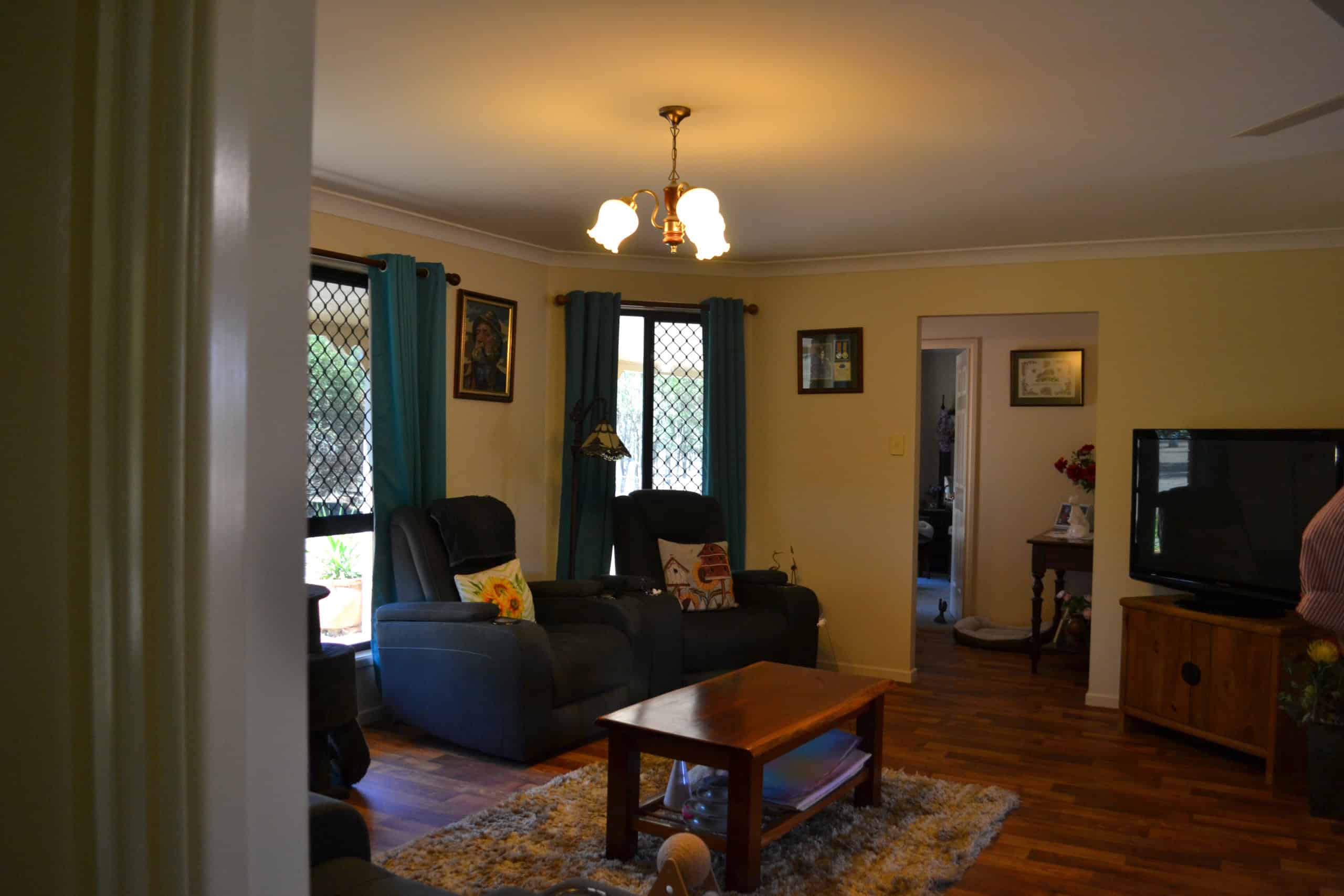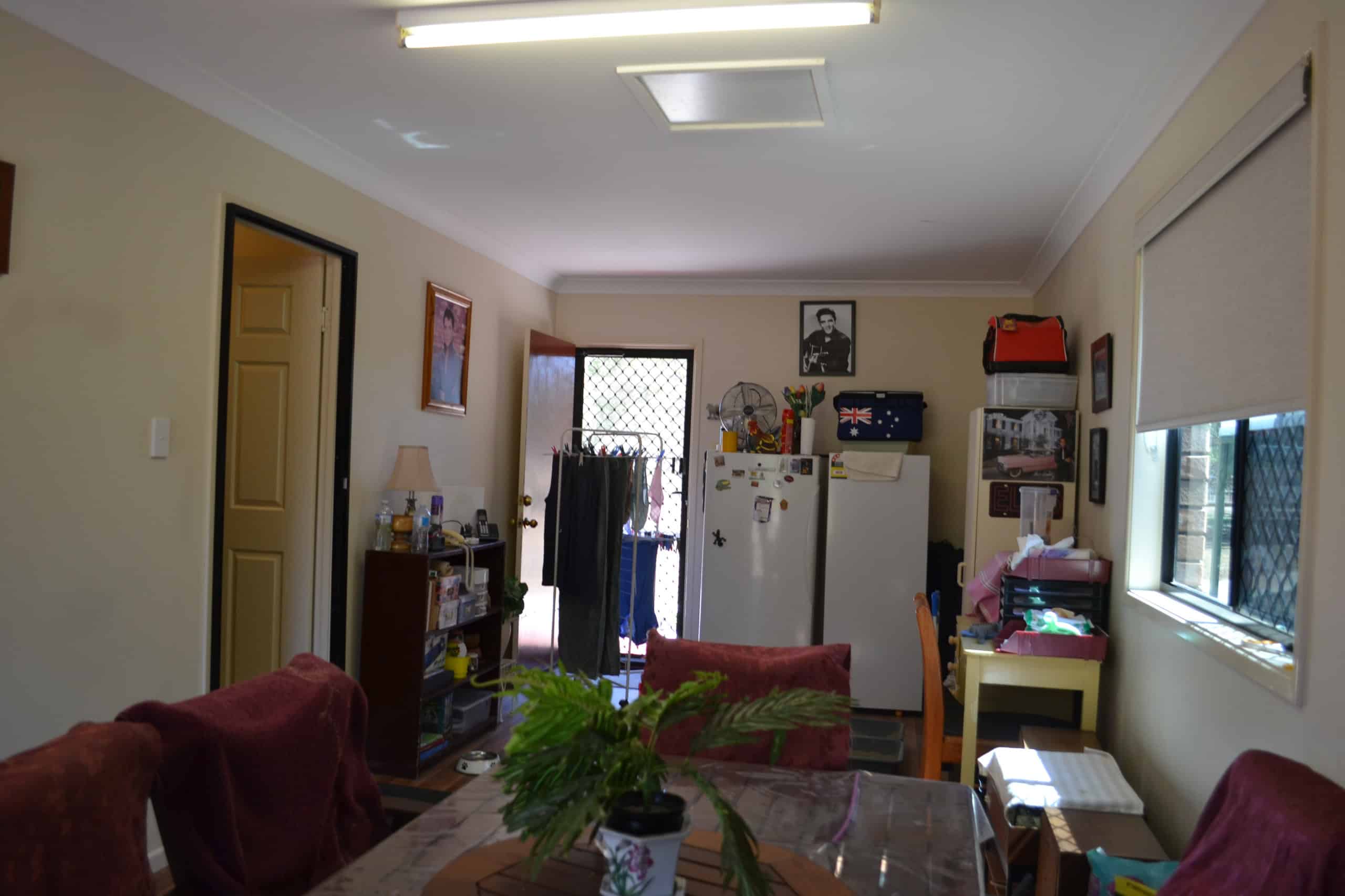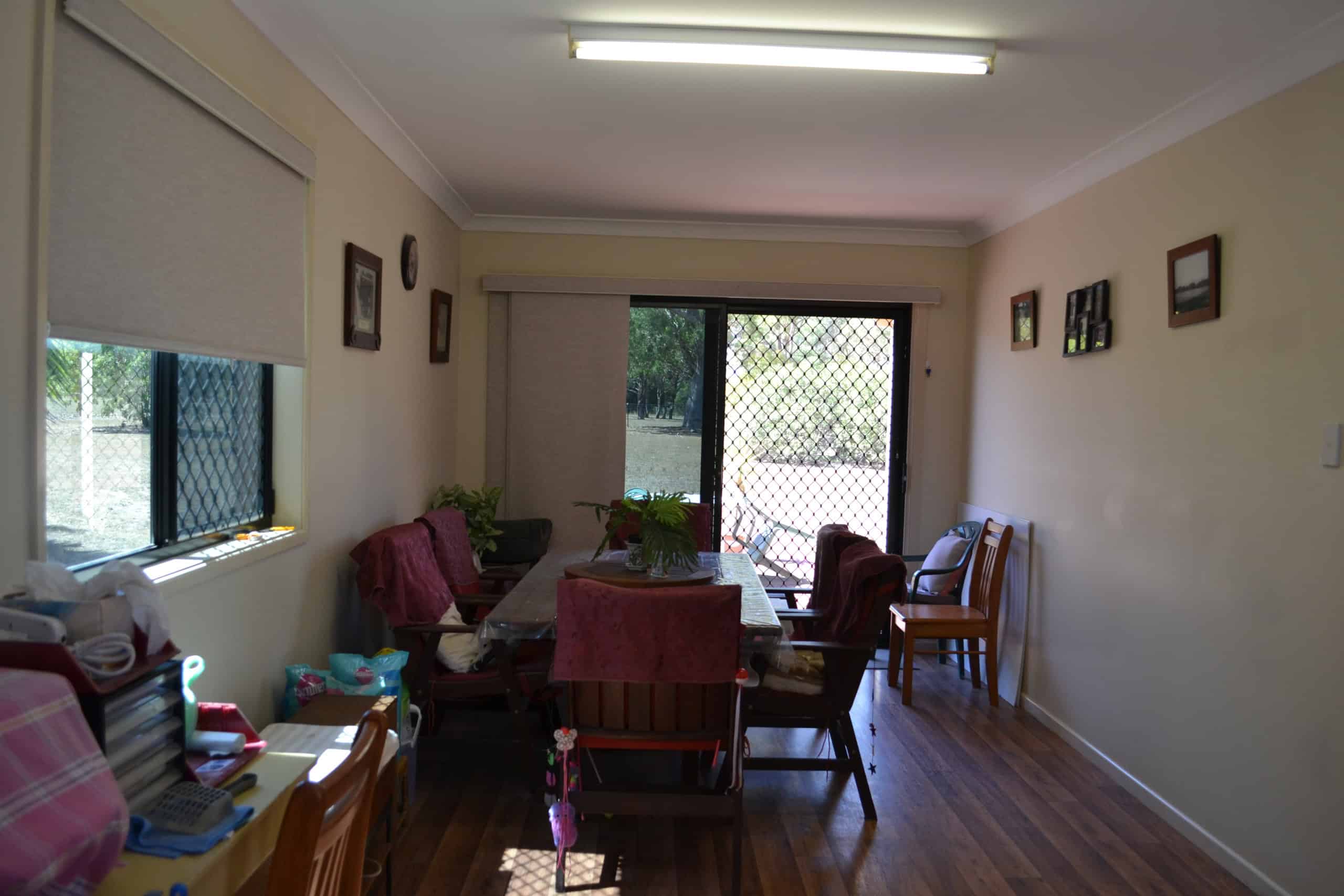 Family Room converted from garage with timber look vinyl flooring, sliding screen door to front yard, smaller screen door to back yard