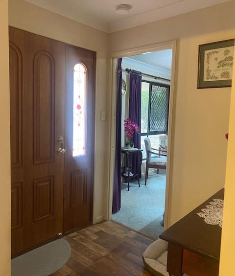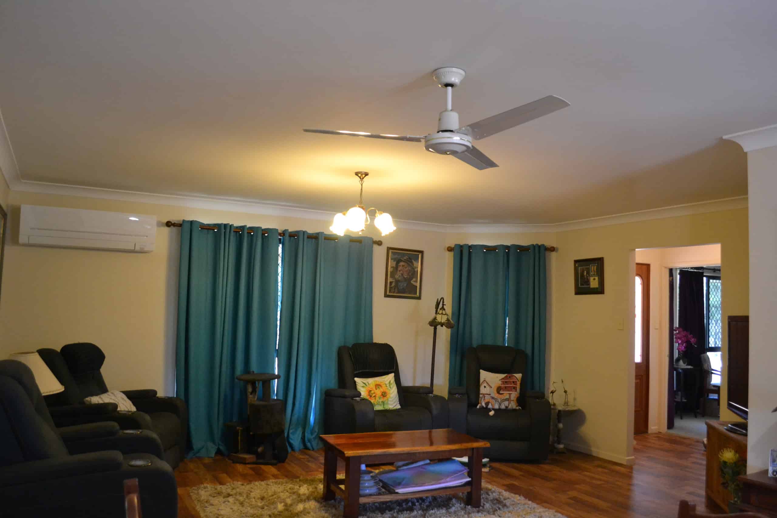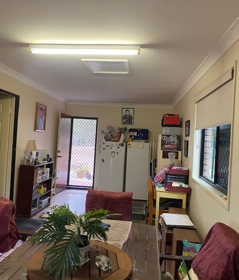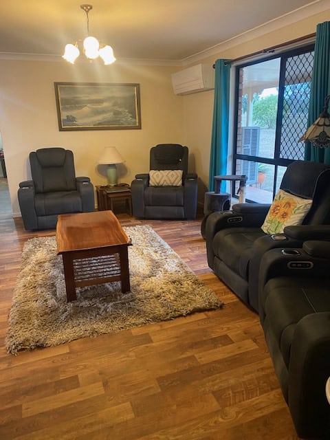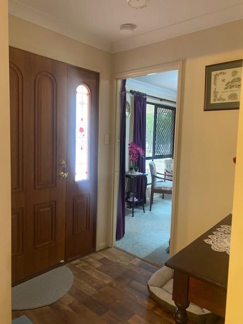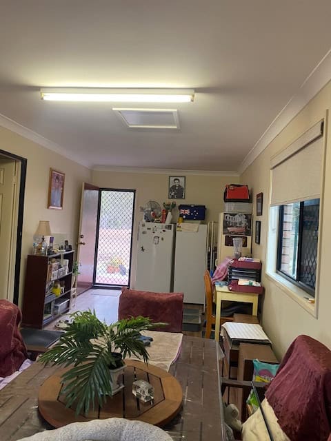 Family Room converted from garage with timber look vinyl flooring, sliding screen door to front yard, smaller screen door to back yard