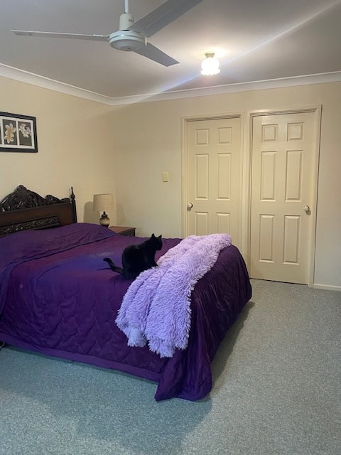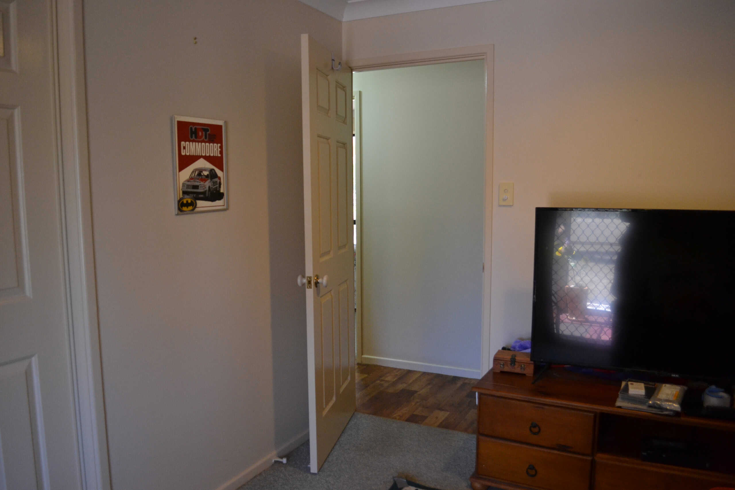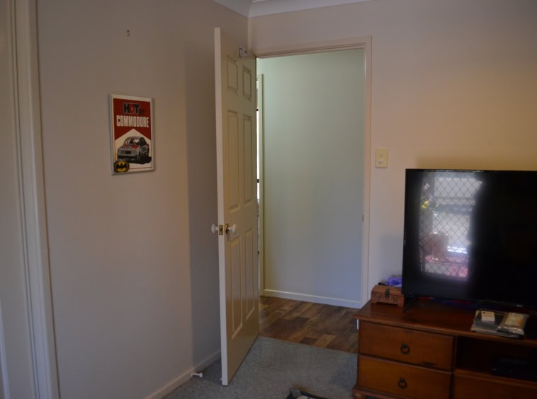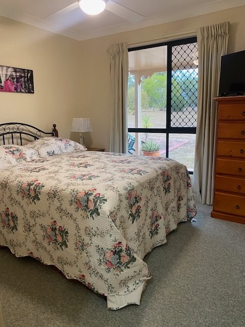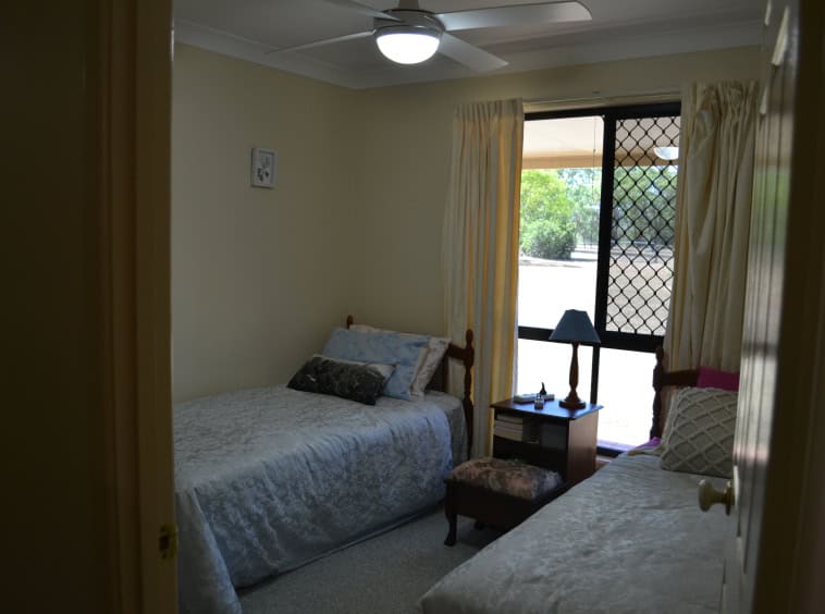 Bedroom 4 – carpet, built-ins and screen sliding door to back yard