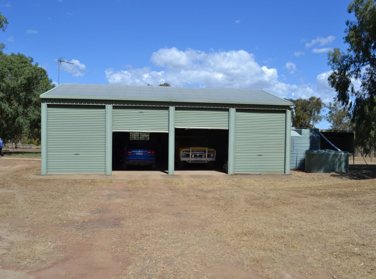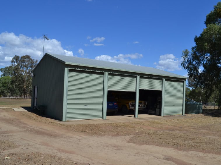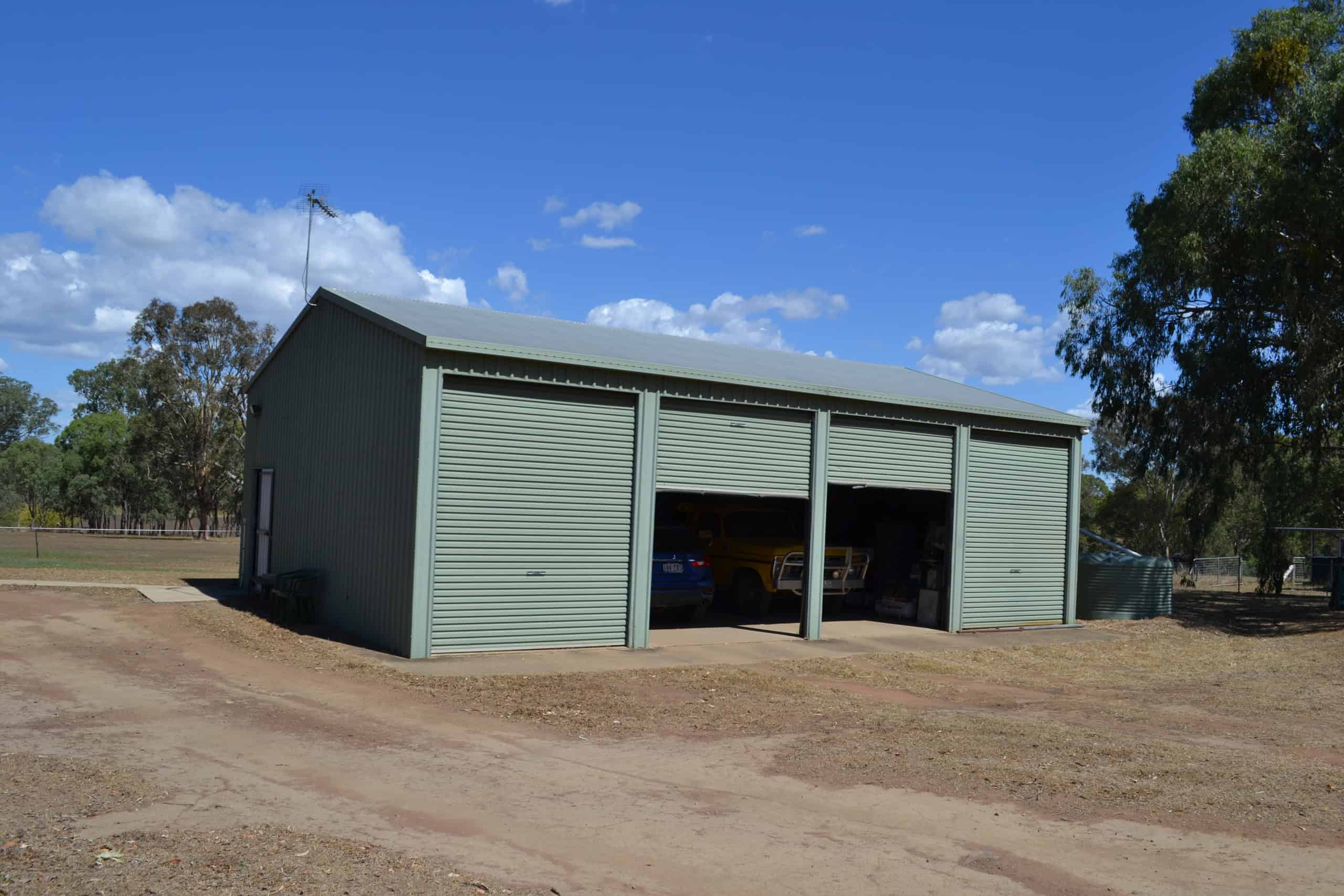 :Shed 1 – 4 bay (12m x 9m x 3.2m) steel fully lockable with roller doors and concrete floor